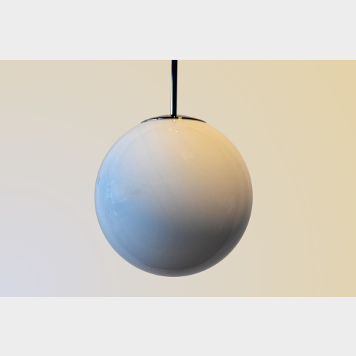 Lampada a soffitto in stile anni ’60 in vetro soffiato bianco latte satinato.