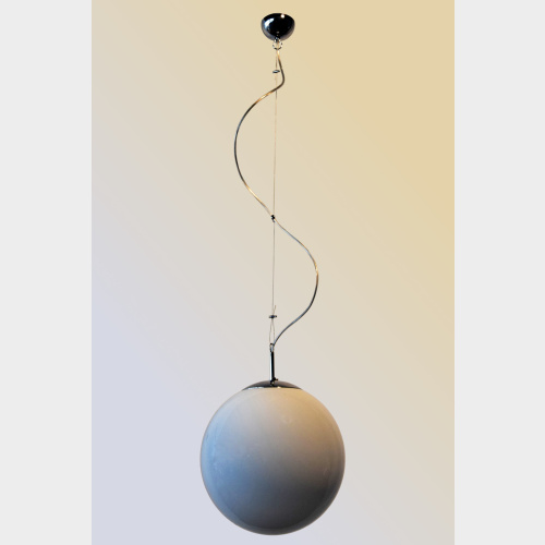Lampada a sospensione. Vetro opalino soffiato in gabbia di metallo.