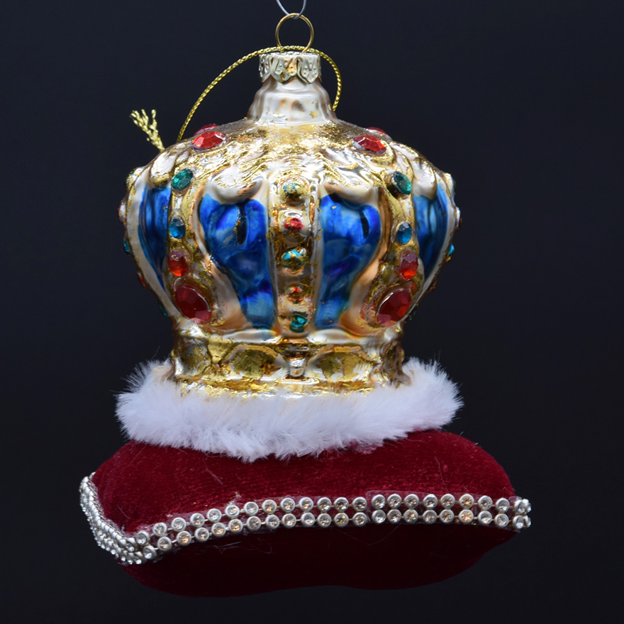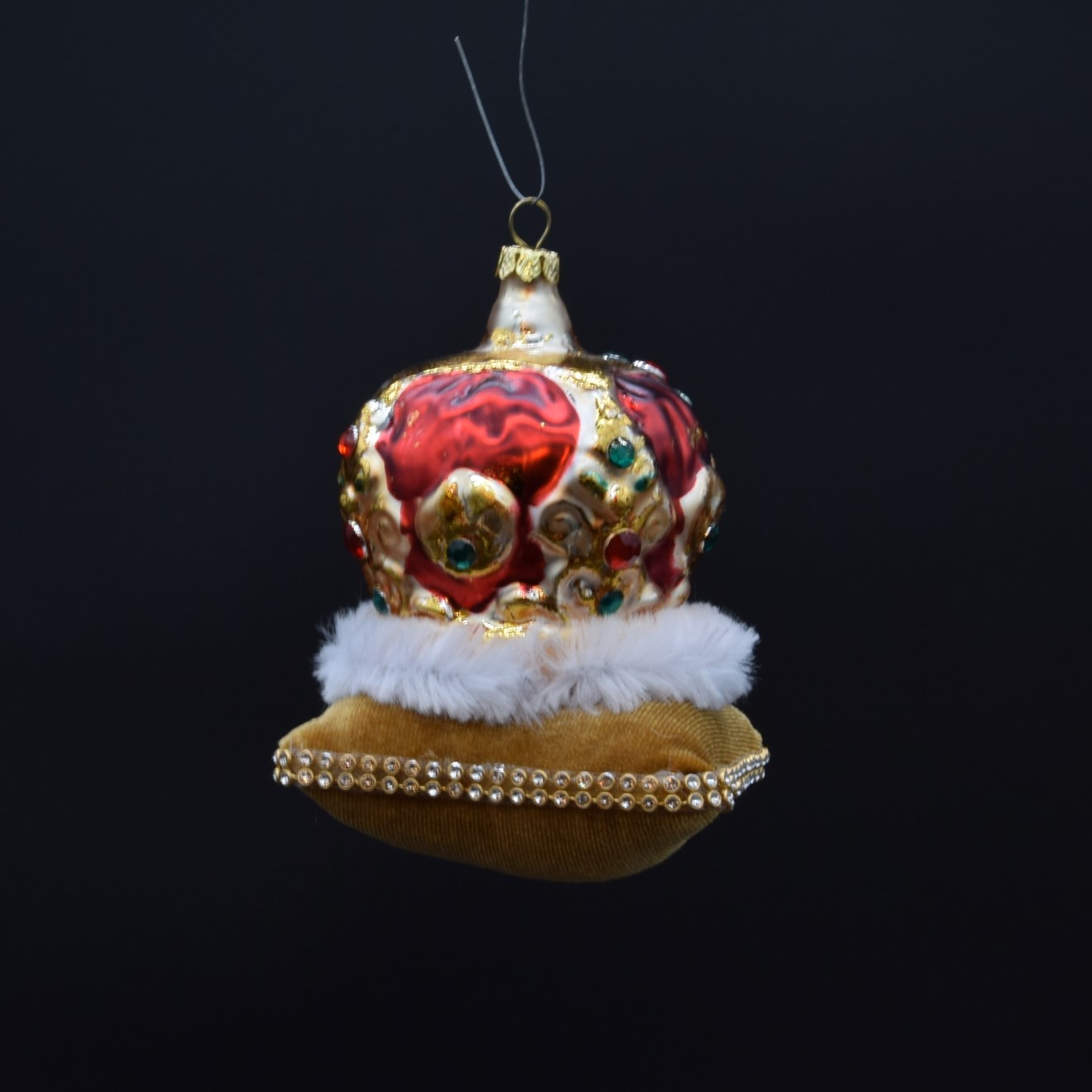 Raffinata decorazione natalizia in vetro soffiato, modellata come una corona reale ricca di dettagli dorati, smalti e piccole gemme colorate. Alcune poggiana su un cuscino di velluto dorato rifinito con perline e bordo in pelliccia bianca.