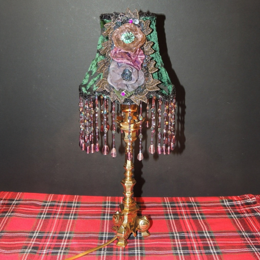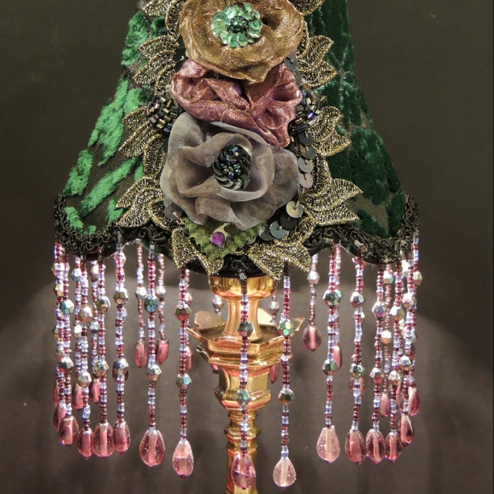 La lampada da tavolo ROSSI Illuminazione Vicenza presenta un paralume in velluto verde con decorazioni floreali tridimensionali, realizzate a mano con pieghe di tessuto metallizzato nei toni dell’oro, del malva e del grigio perla. Al centro, un raffinato bouquet di fiori in stoffa con inserti di perline e paillettes, incorniciato da foglie dorate ricamate che donano profondità e lucentezza alla composizione.