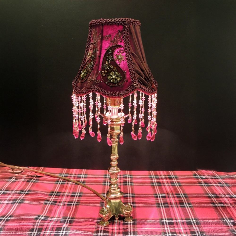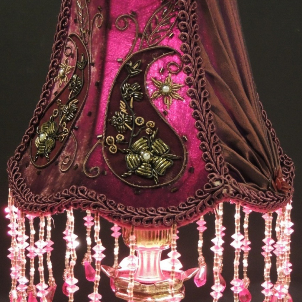 Un’elegante lampada da tavolo dal fascino rétro, con paralume in velluto impreziosito da ricami dorati e dettagli di perle. I pendenti creano un delicato gioco di riflessi, diffondendo una luce calda e accogliente. Perfetta come complemento d’arredo o decorazione natalizia, unisce l’eleganza artigianale al gusto classico dell’illuminazione d’interni.