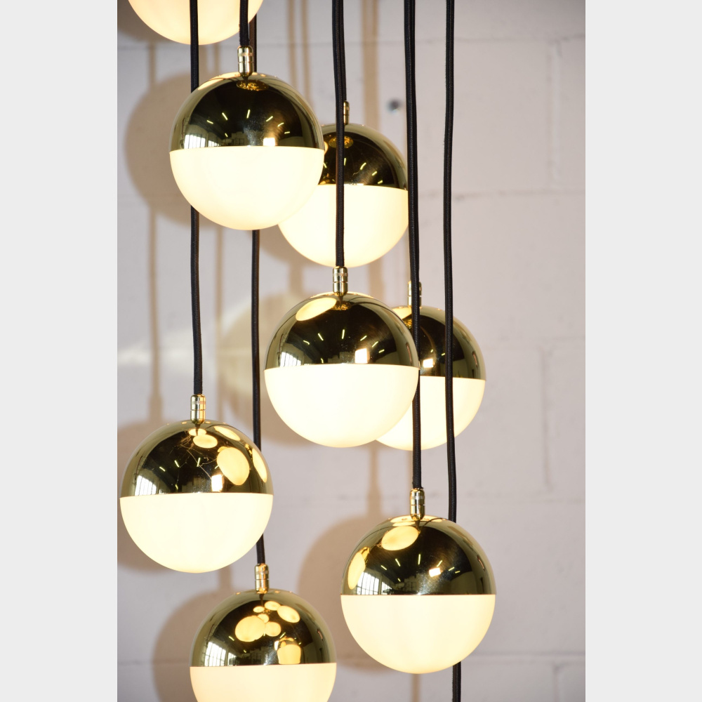 Mezzesfere chandelier in polished brass. This hanging lamp is made up of falling white glass spheres, opal and satin. The shape of the glass half-spheres is completed by a structure in polished brass, lacquered. The Mezzesfere chandelier has 9 lights and provides lighting which can meet different needs, whether it is located in a large living room, as well as a dining room or kitchen.