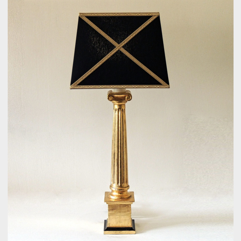 Column Table lamp in the Ionic style, carved and painted gold wood. Shade in black chintz edged in gold.