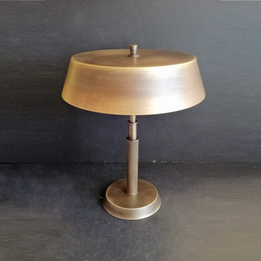 FA Table Lamp, handcrafted. The vintage look recalls the style of the 50s, with simplicity and elegance. Like the wall counterpart, this table lamp has two lights and a polished brass finish, while the lampshade and base are made of wrinkled painted metal. The table lamp FA originally has a retro style but stands out even within a modern environment. Ideal for the office or the bedroom, it sits perfectly on a desk or a bedside table.