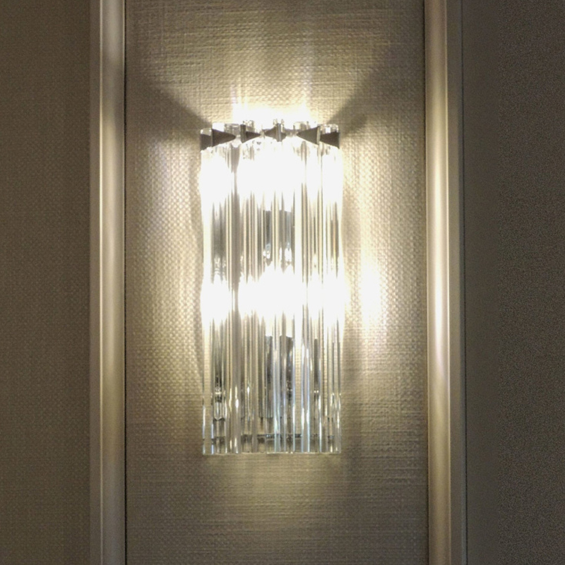 Triedri wall lamp composed of a row of glasses arranged in a semicircle, with two lights. The particular composition of crystals characterizes this wall lamp ensuring effective lighting. The light is diffused in a harmonious way also thanks to the brilliance of the trihedrons, which in turn is highlighted. It is a lamp capable of enhancing different rooms with its elegance, suitable for example for a large living room, a bedroom or a dining room. The Triedri wall lamp recalls the style of our Triedri Chandelier.