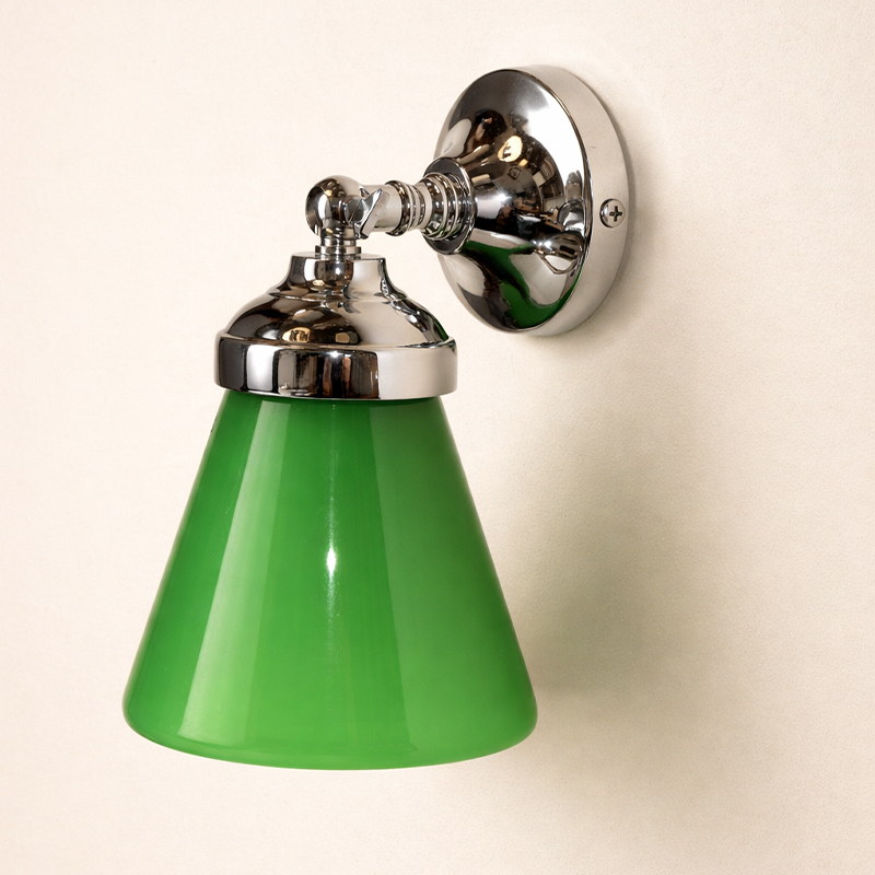 Elemento distintivo è il paralume in vetro, disponibile in diverse forme e finiture (verde, bianco latte oppure prismato), con possibilità di personalizzazione per adattarsi allo stile dell’ambiente.