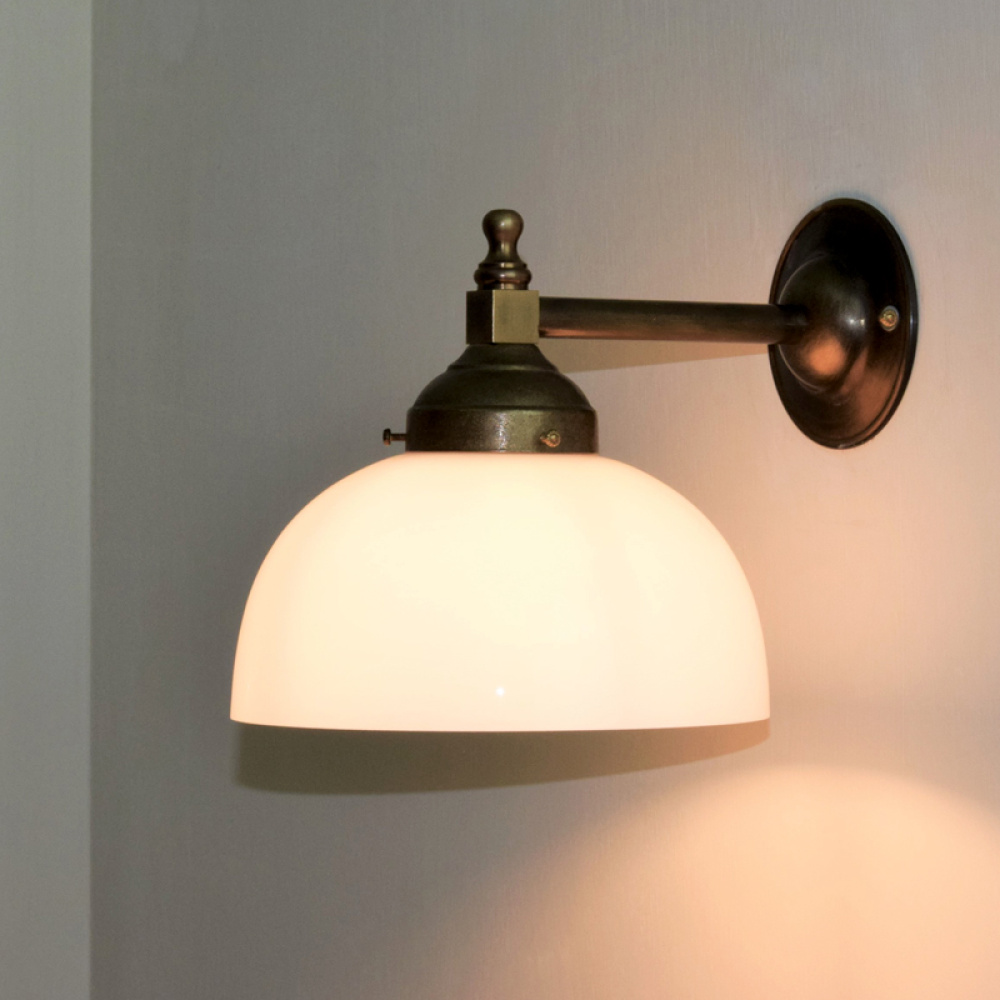 Lampada a parete realizzata in ottone brunito con diffusore in vetro opalino bianco latte, dal design classico ed elegante.