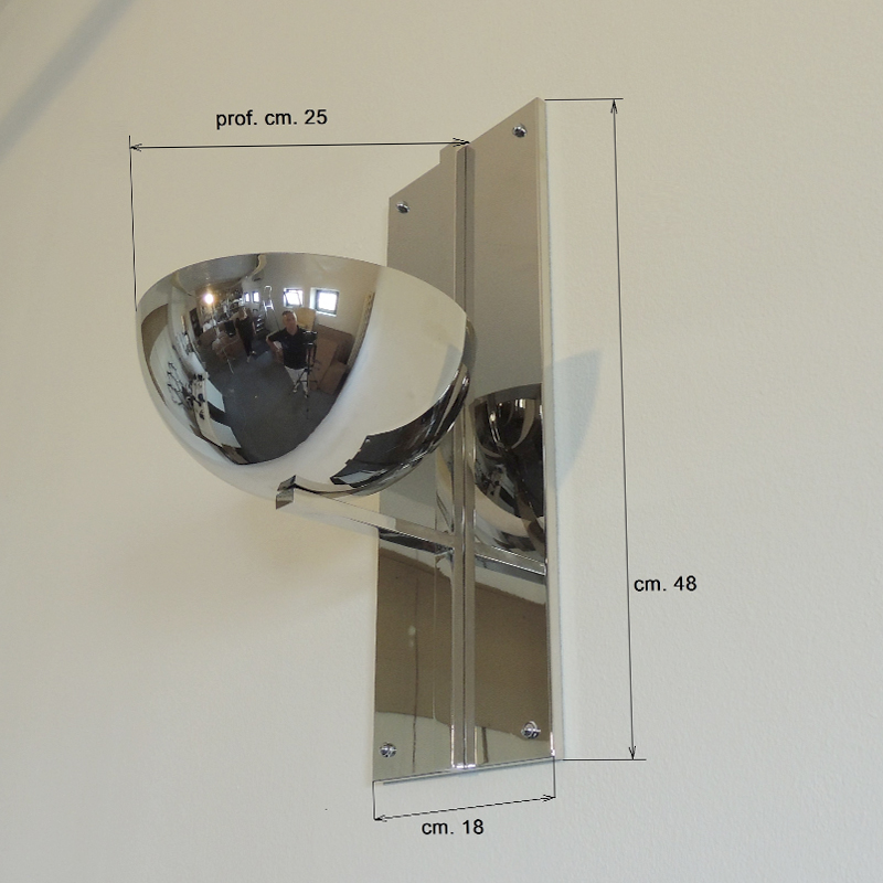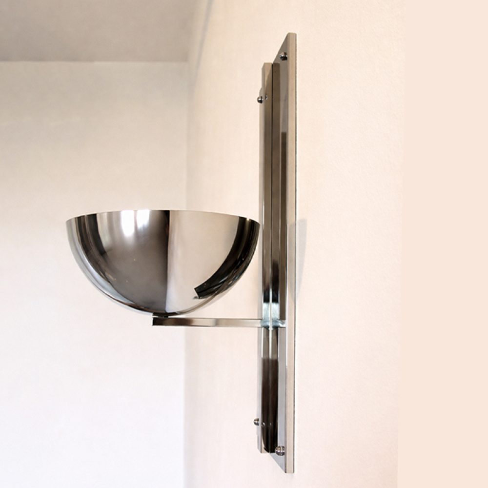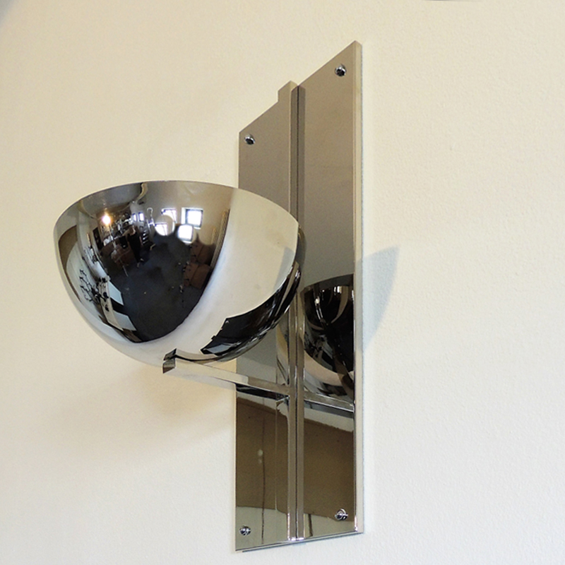 Lampada a parete in ottone lucido nichelato, caratterizzata da linee pulite ed essenziali ispirate allo stile Hoffmann, che unisce rigore geometrico ed eleganza senza tempo.