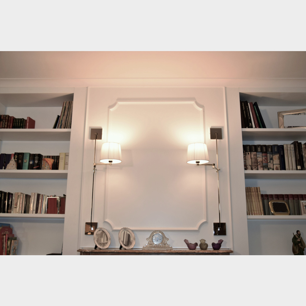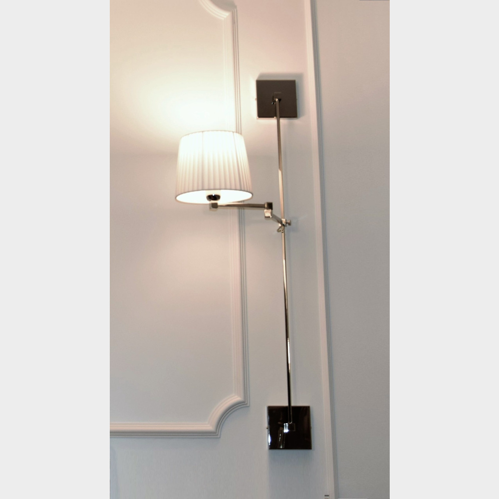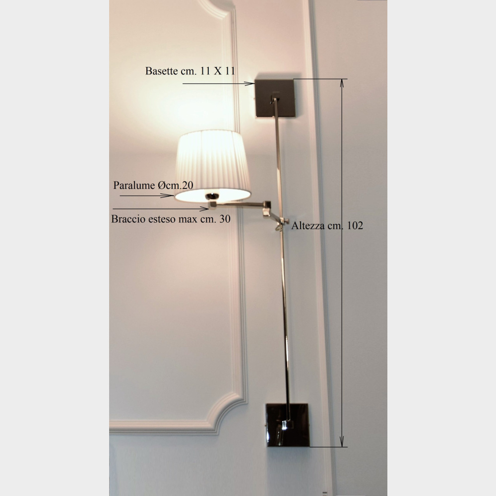 Lampada a parete saliscendi. Braccio con doppio snodo e paralume in tessuto.