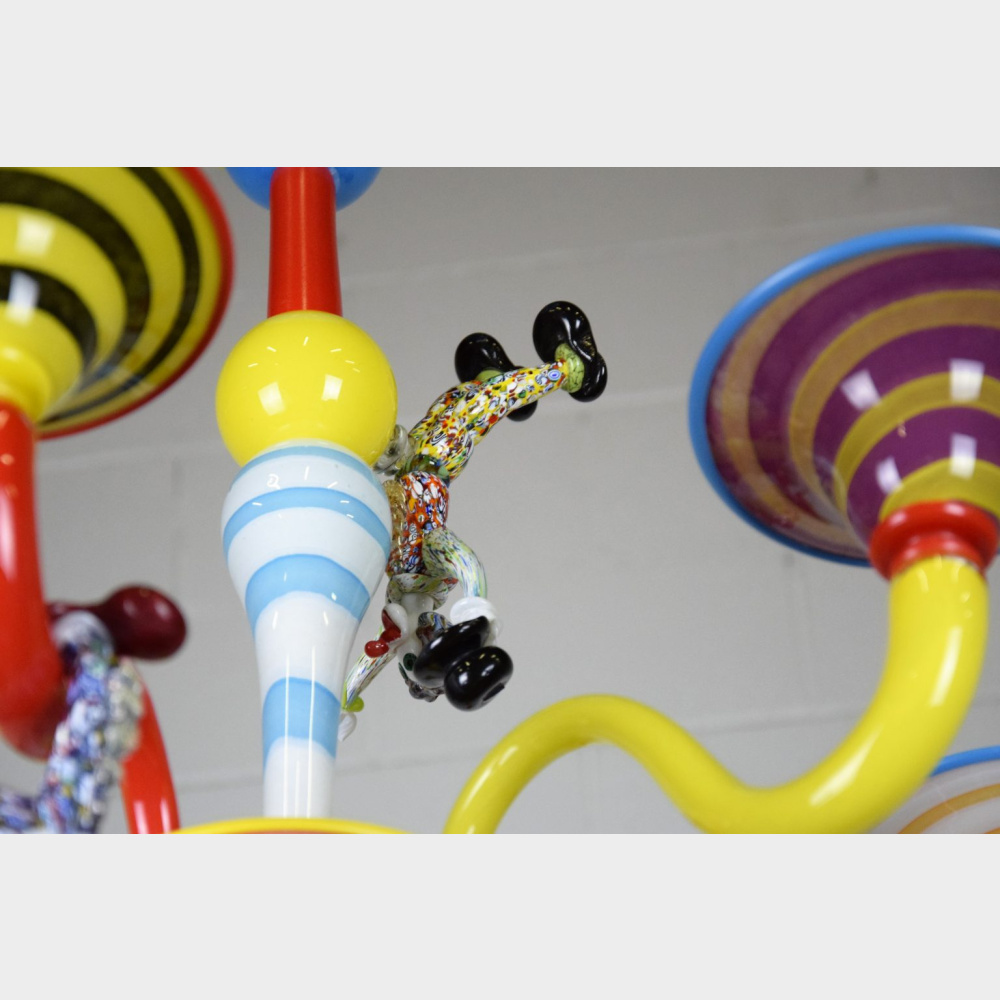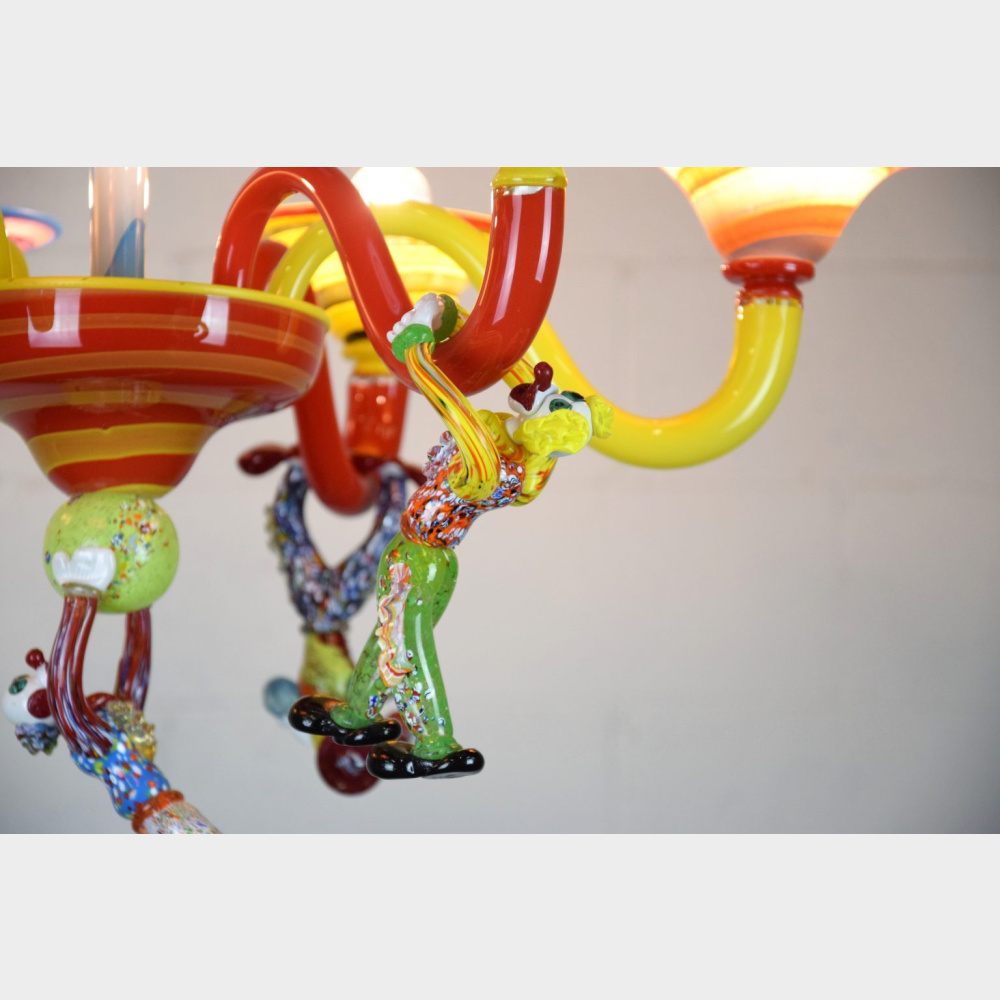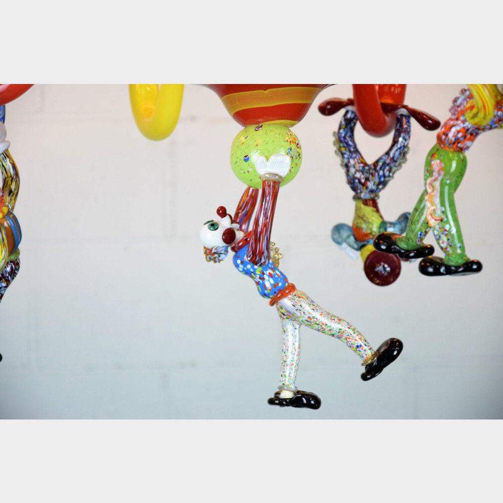 Lampada Pagliacci. Questa coloratissima lampada da soffitto in vetro di Murano si compone di 6 bracci, e di numerosi “pagliacci” che in varie pose ornano la struttura.