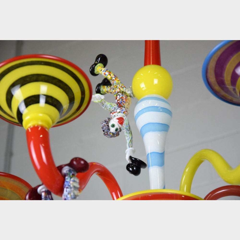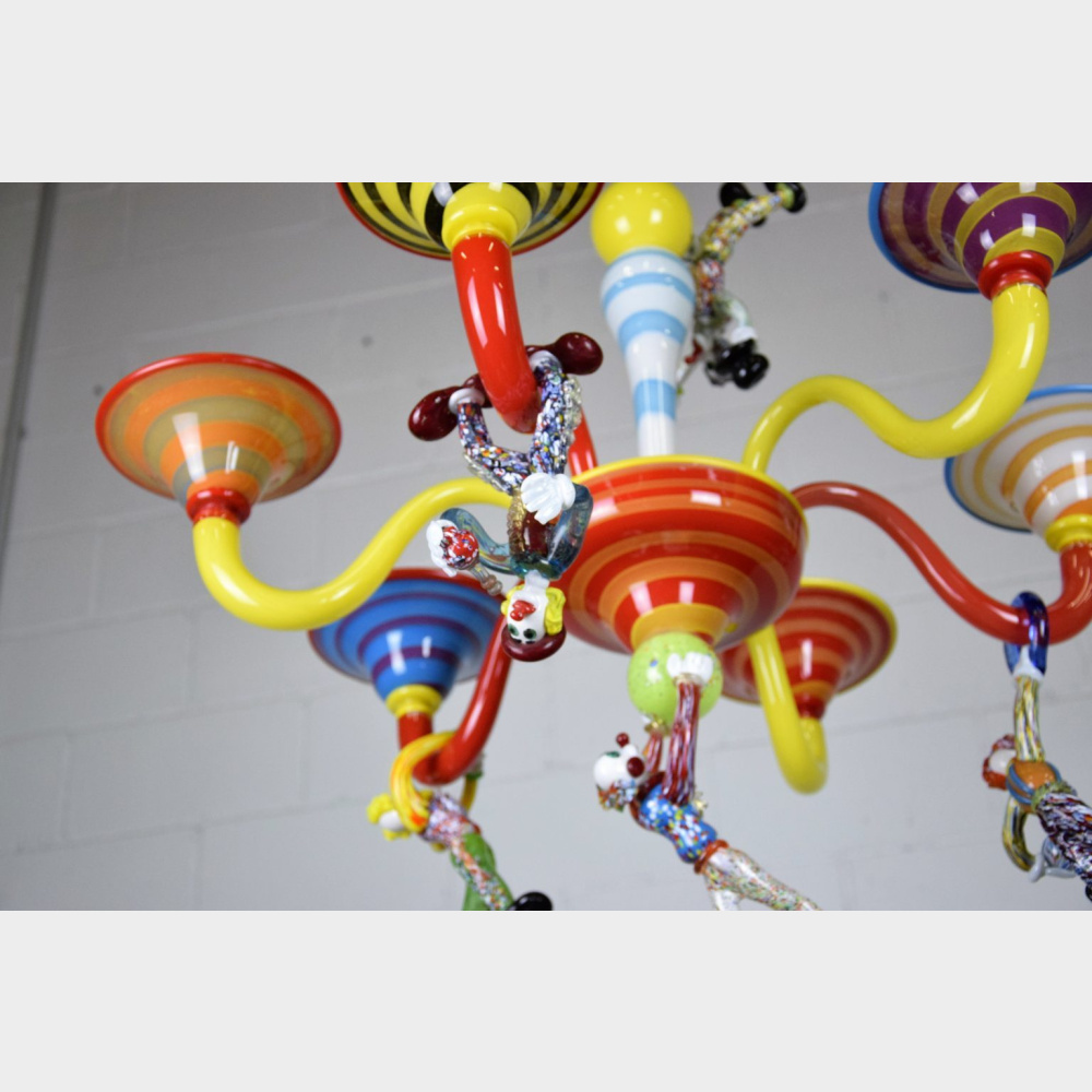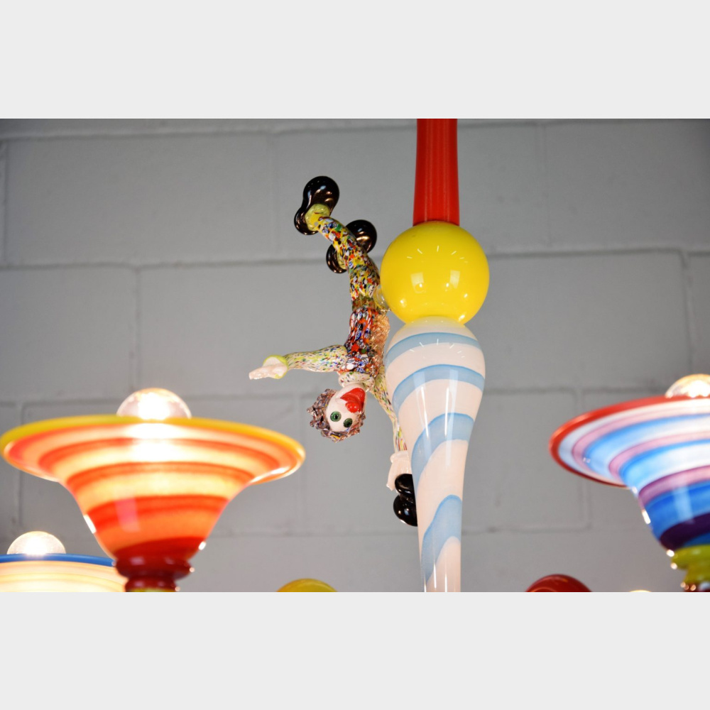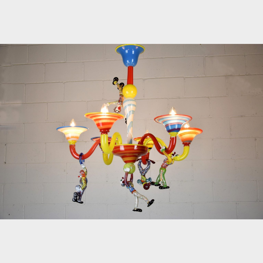 Lampada Pagliacci. Questa coloratissima lampada da soffitto in vetro di Murano si compone di 6 bracci, e di numerosi “pagliacci” che in varie pose ornano la struttura.