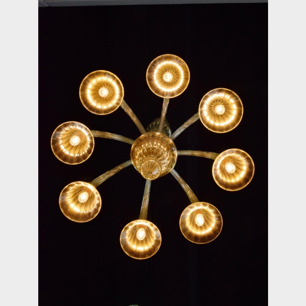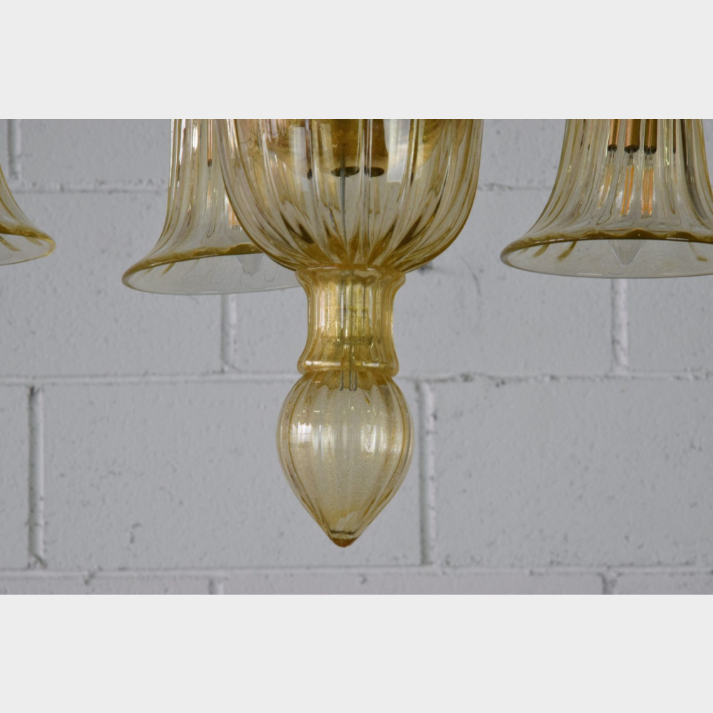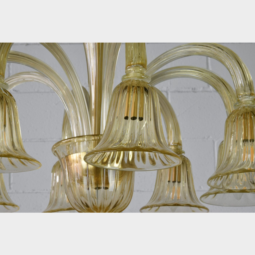 Lampadario di Murano, 8 Luci a cascata. Questo lampadario in stile classico, in vetro di Murano dorato, è composto da 8 bracci e altrettante campane in vetro disposte a cascata.