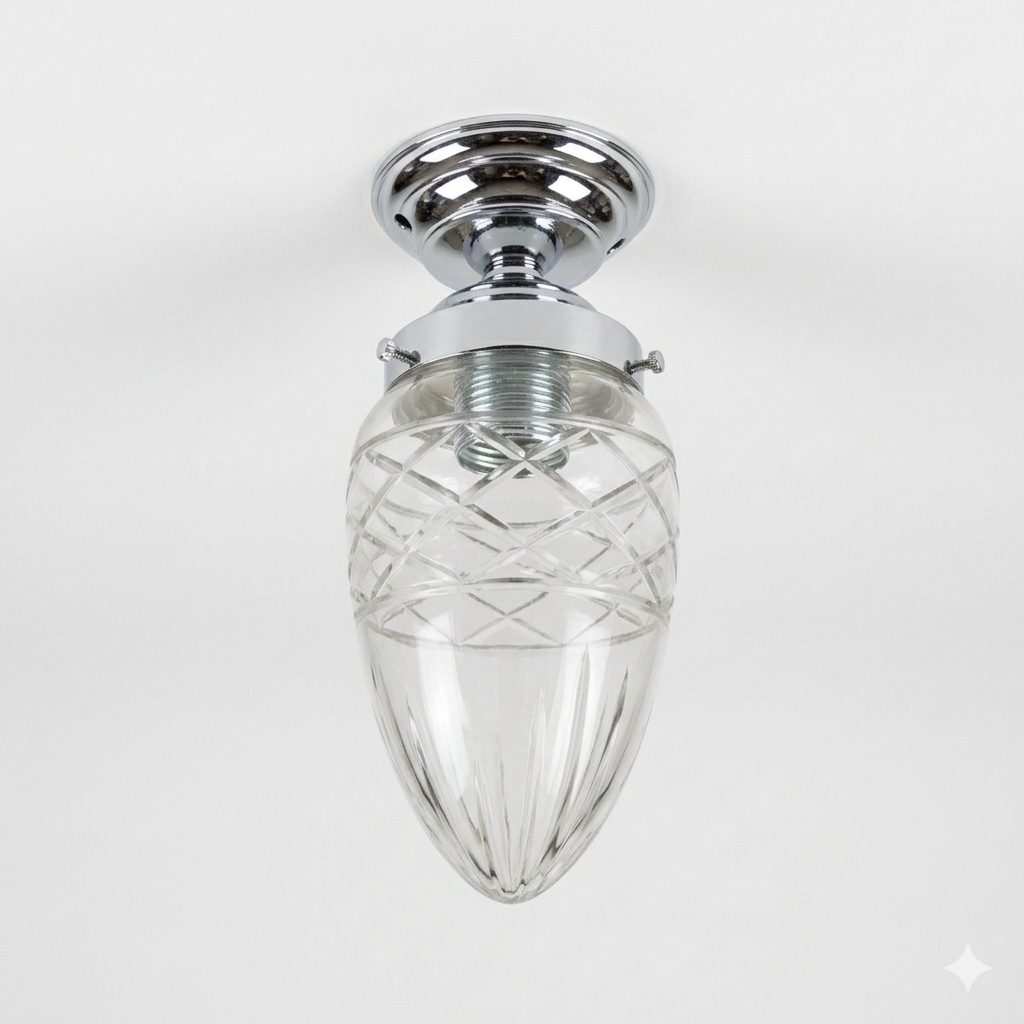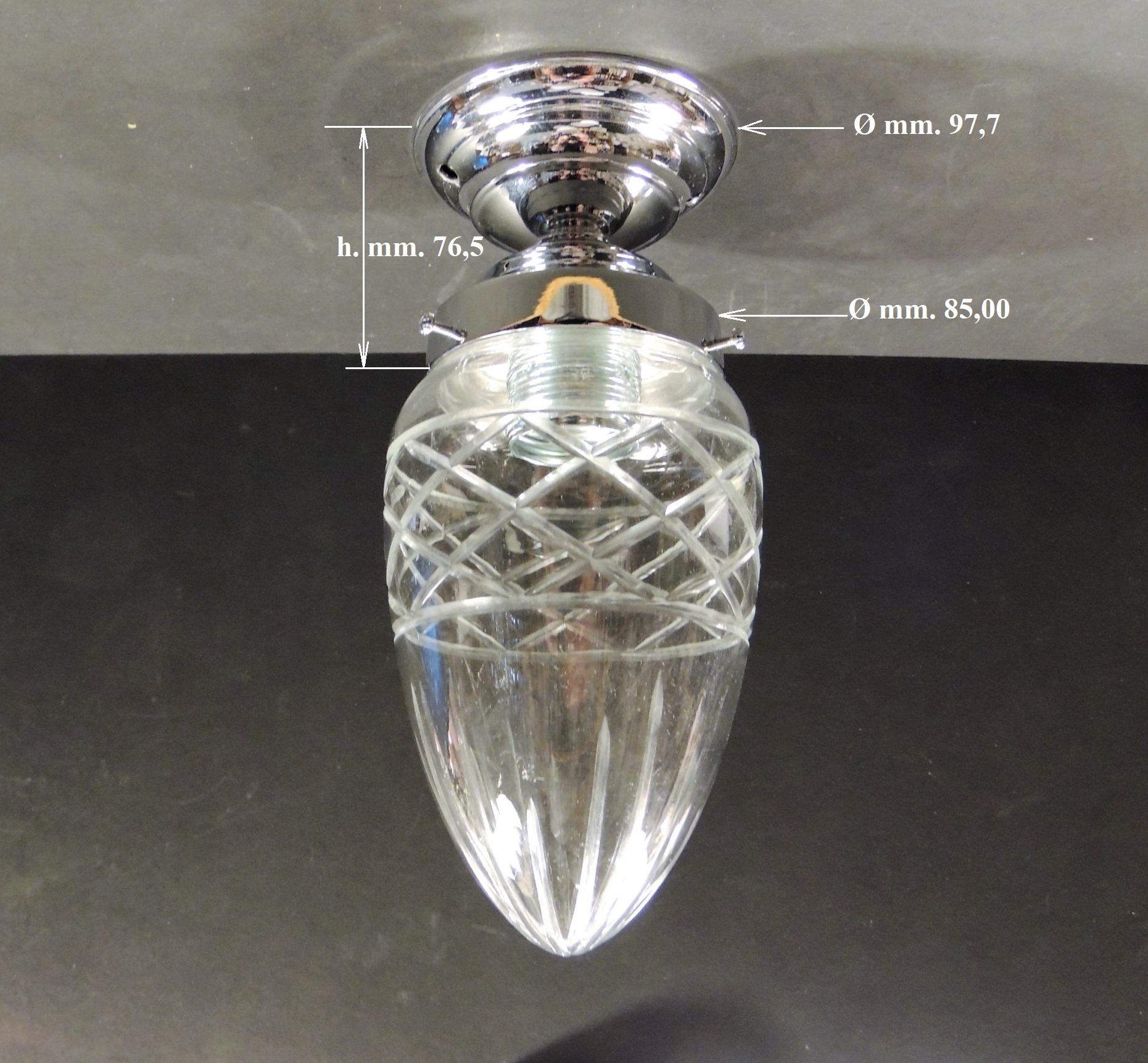Lampada a soffitto modello Mercury Pigna in vetro trasparente molato e ottone cromato.