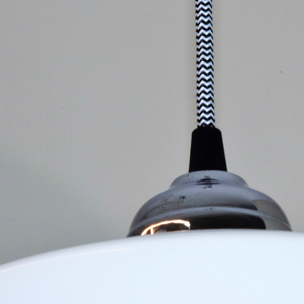 La sospensione Art. LS 11 è una soluzione d’illuminazione essenziale che punta sulla qualità dei materiali e sul contrasto cromatico. Il paralume è realizzato in vetro opalino bianco latte, il design è caratterizzato da componenti in ottone cromato, che includono il reggivetro e il rosone a soffitto, garantendo una tenuta robusta e una lucentezza moderna. Un dettaglio distintivo è il cavo elettrico in tessuto moschettato bianco e nero, che conferisce alla lampada un carattere grafico e contemporaneo, alternando la monocromia del vetro.