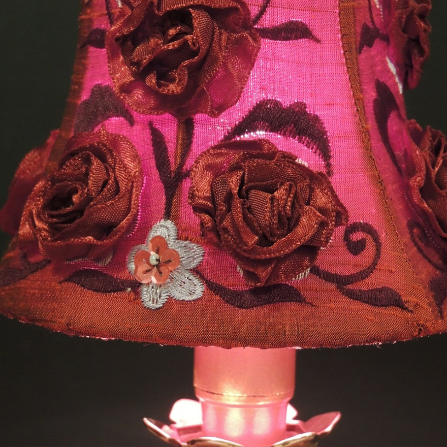 La base in ottone, finemente sagomata, sostiene un paralume in tessuto rosso decorato a rilievo con applicazioni floreali tridimensionali. Le rose in tessuto plissettato, si alternano a ricami di foglie e motivi ornamentali in filo lucente, impreziositi da piccole paillettes e perline che riflettono la luce con delicatezza.