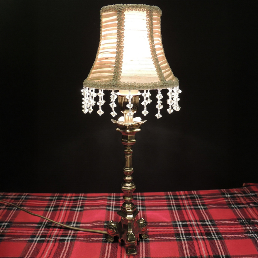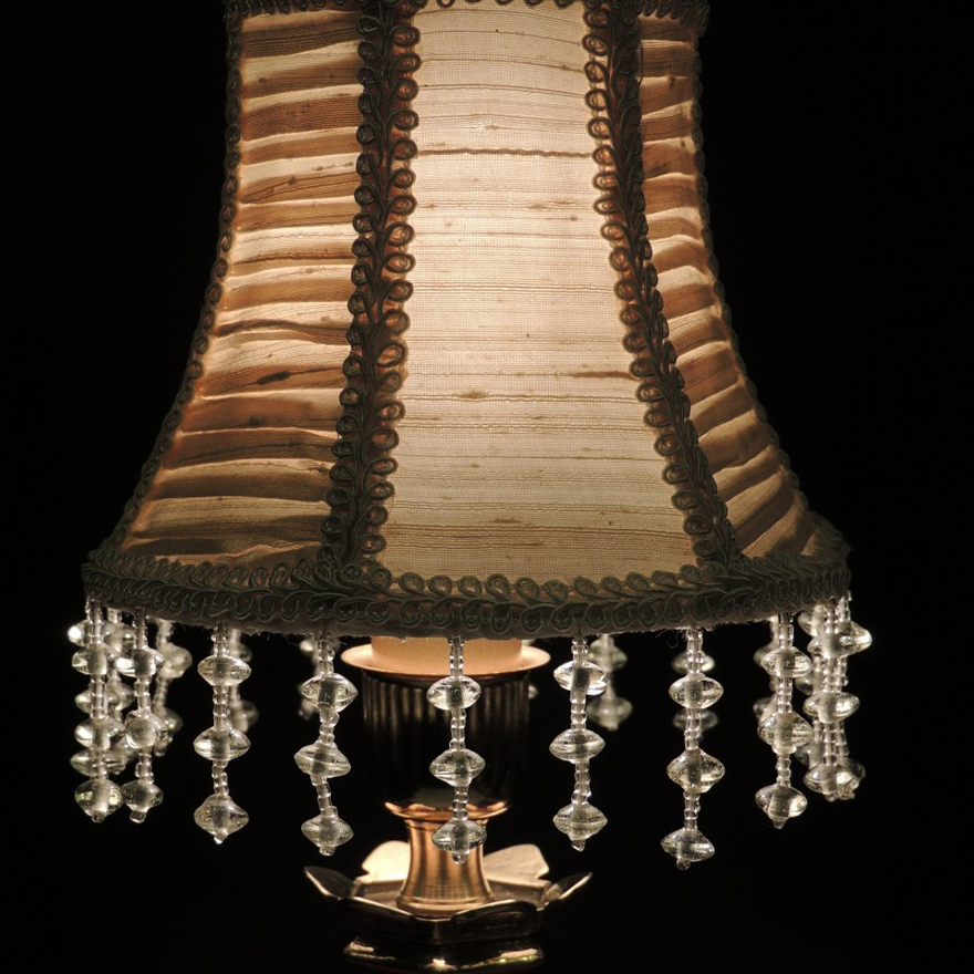 La base in ottone lucido sostiene un paralume in seta grezza plissettata color champagne, impreziosito da una delicata passamaneria che ne sottolinea il profilo. La superficie del paralume, lavorata con pieghe regolari, diffonde una luce calda e morbida, creando un’atmosfera accogliente e sofisticata.