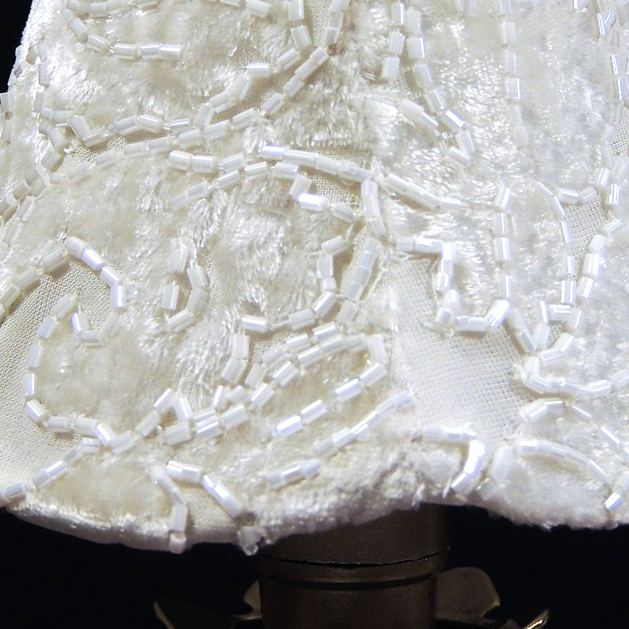 La base in ottone, finemente lavorata, sostiene un paralume in velluto avorio ricamato a mano con perline di vetro traslucide, disposte in un delicato motivo floreale e arabescato. La texture soffice del velluto, unita alla brillantezza delle microperle, crea un effetto cangiante e prezioso, esaltato dalla luce calda che filtra attraverso il tessuto.