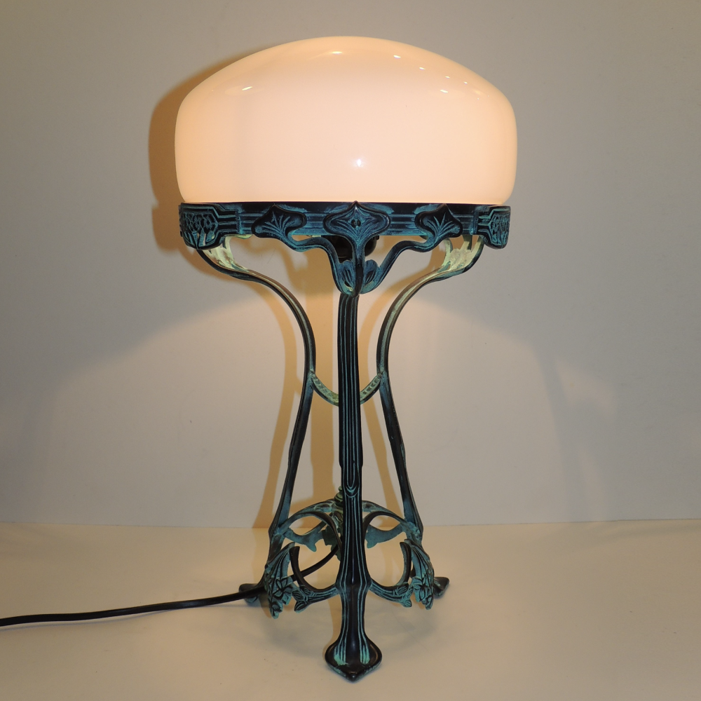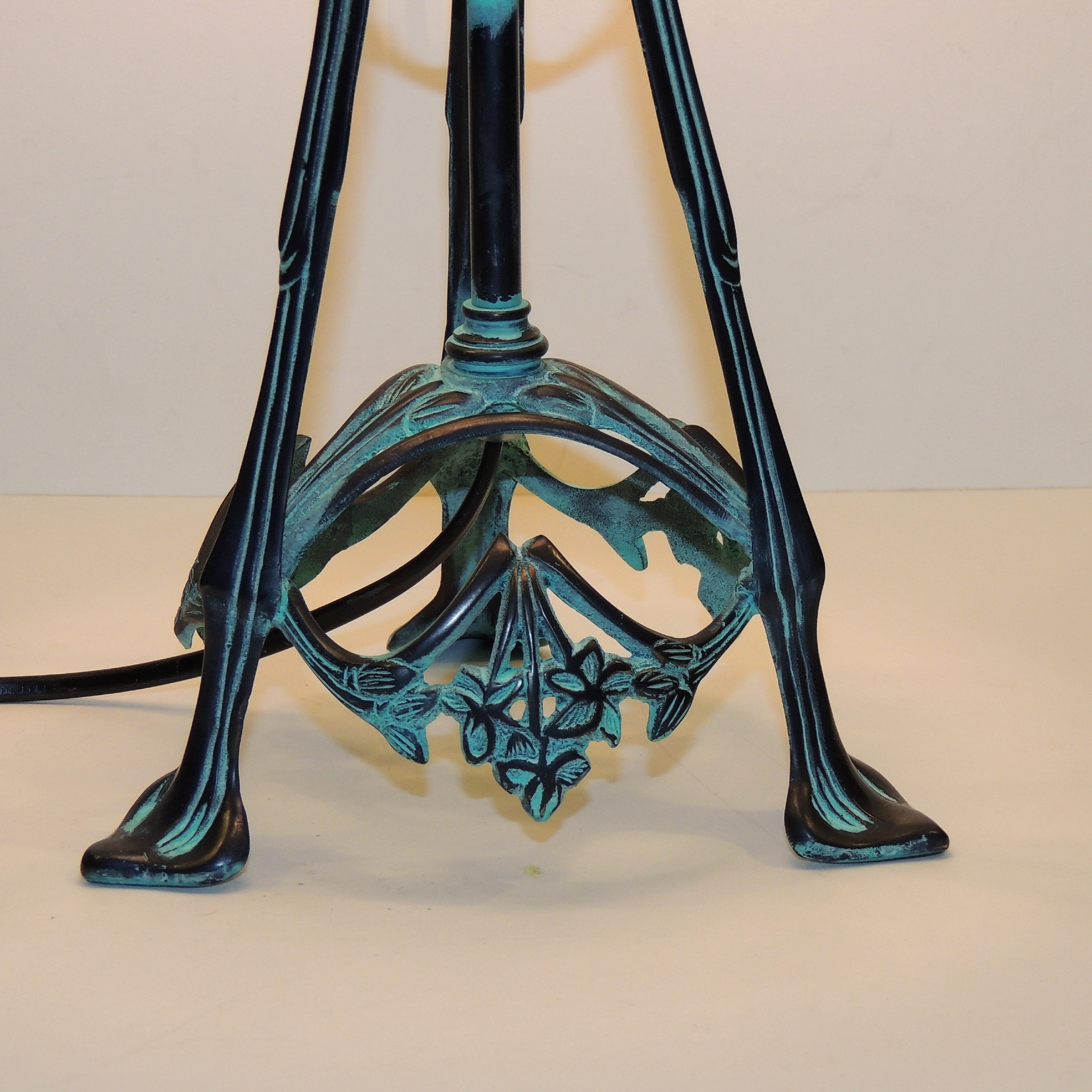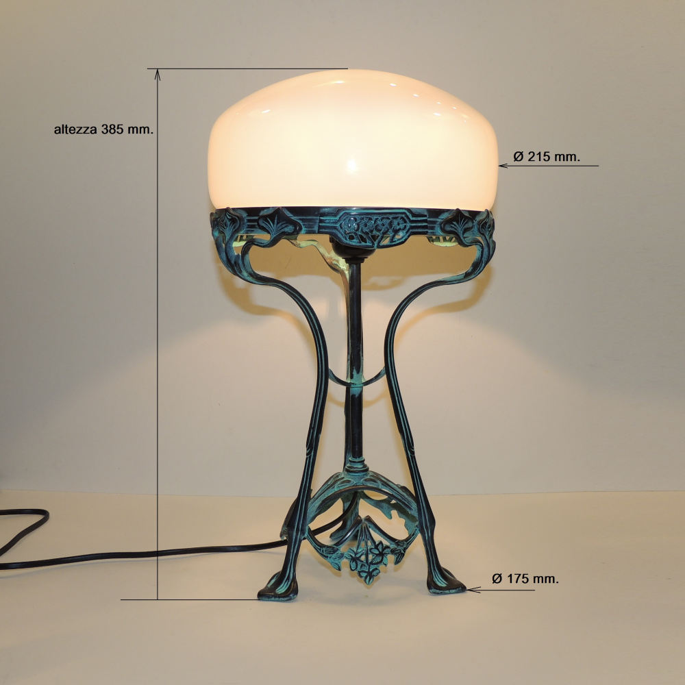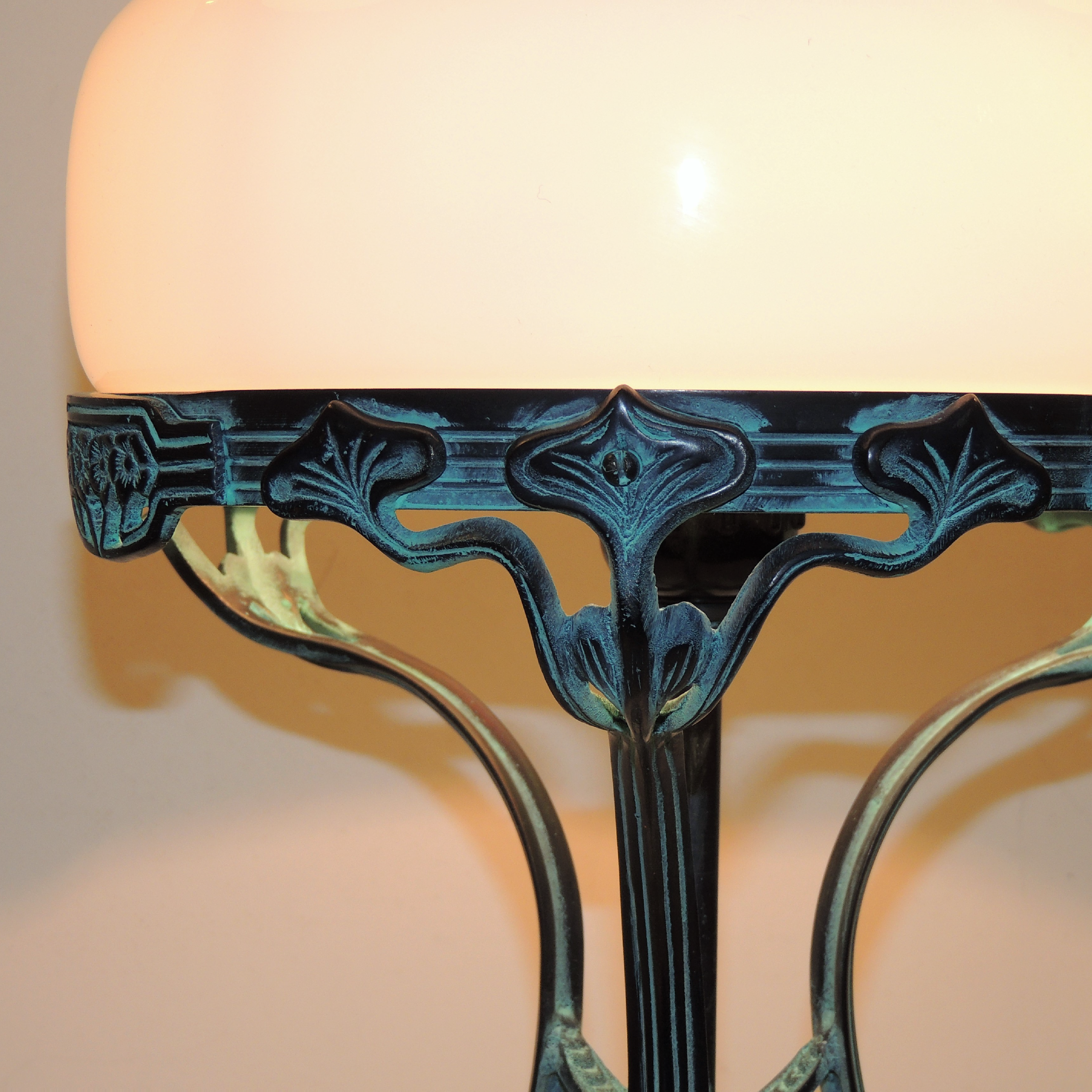Magnifico esempio di lampada in stile floreale Viennese pre secessionista, base in fusione di ottone verde ossido, paralume in vetro opalino bianco latte.