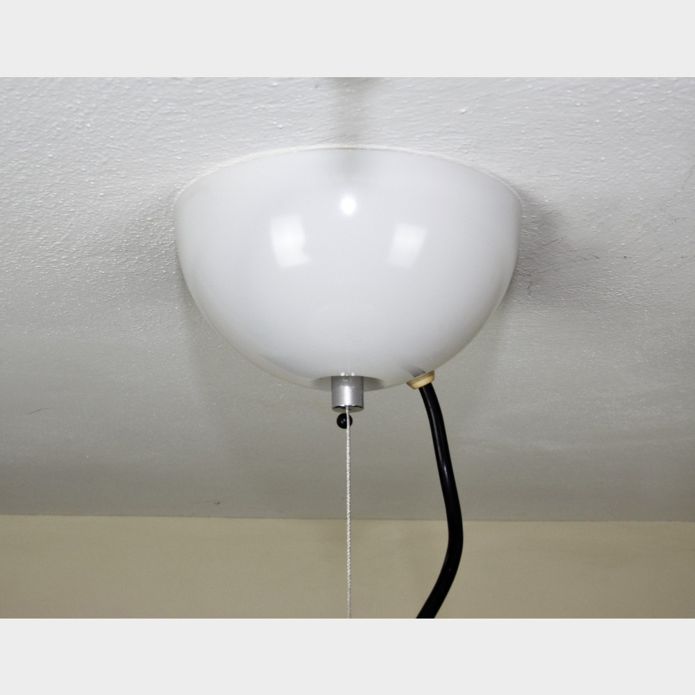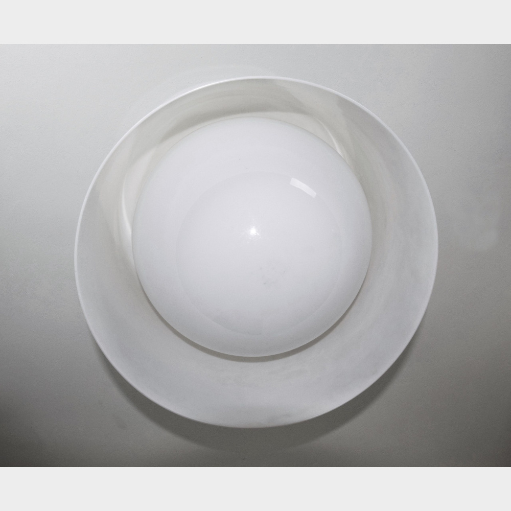 Il rosone della lampada completa l’opera illuminante, presentando un’altra mezza sfera in policarbonato bianco. Questo elemento aggiuntivo non solo fornisce una finitura armoniosa alla lampada, ma contribuisce anche a diffondere la luce in modo uniforme e delicato.